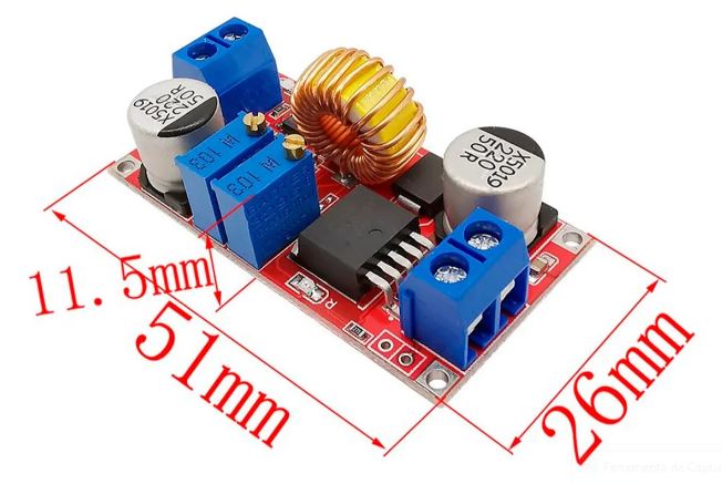OBS: Esse é um regulador do tipo Step Down, ou seja, na saída dele vai ter uma tensão mais baixa do que é colocado na entrada. Caso queira um módulo que a saída seja mais alta do que a entrada, busque por módulo Step UP.